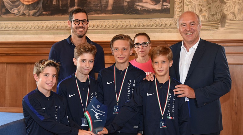 I piccoli atleti della squadra di ginnastica “Artistica Brescia”, accompagnati dalla presidente Esther Puletti, hanno visitato oggi, lunedì 10 settembre, palazzo Loggia. A riceverli l’assessore Valter Muchetti e il consigliere Fabrizio Benzoni, delegato del sindaco per gli eventi sportivi.