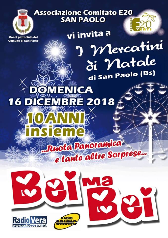 L’Associazione Comitato E20 San Paolo, con il patrocinio del Comune di San Paolo, organizza I Mercatini di Natale Bei ma Bei. Appuntamento importante quest’anno, si celebra infatti il decimo anno dell’iniziativa. Domenica 16 dicembre tutti a San Paolo per fare un giro sulla ruota panoramica e per scoprire tante altre sorprese!