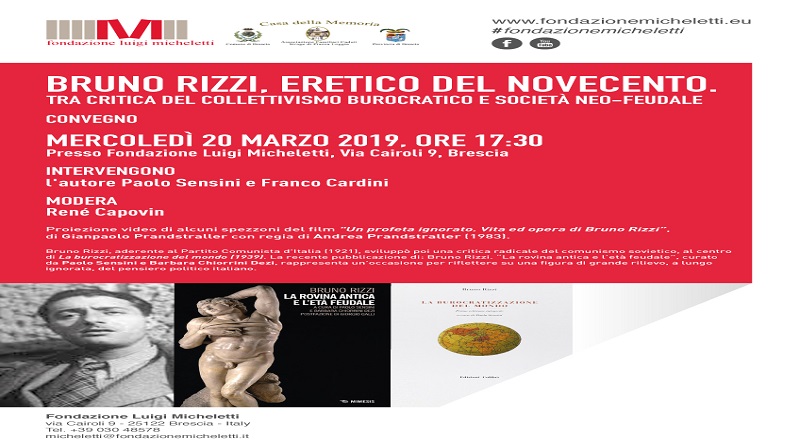 Fondazione Luigi Micheletti, in collaborazione con l’Associazione Casa della Memoria, organizza, per mercoledì 20 marzo, il convegno Bruno Rizzi, eretico del Novecento. Tra critica del collettivismo burocratico e società neo-feudale.