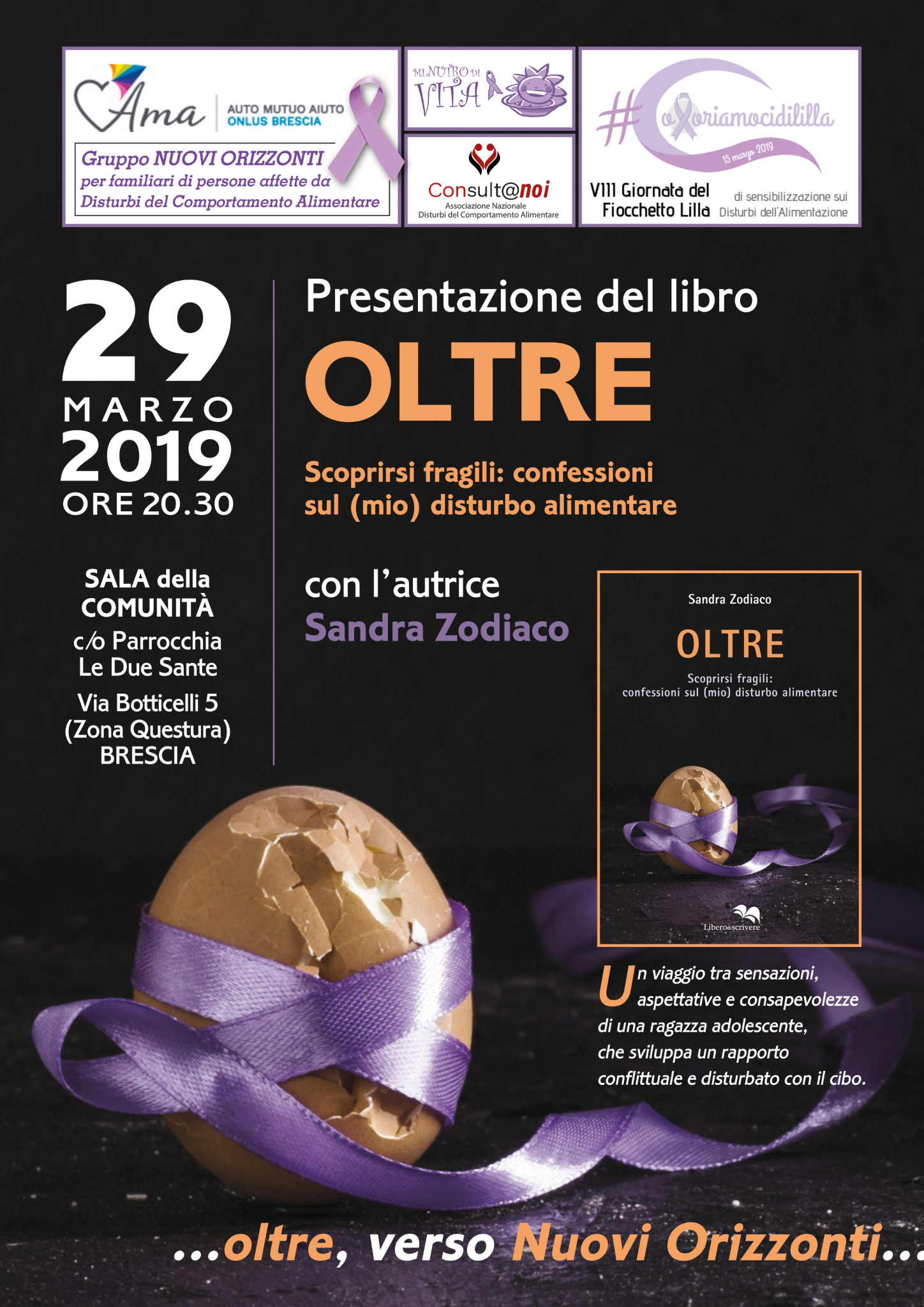 Il gruppo “Nuovi Orizzonti”, composto da familiari di persone affette da Disturbo del Comportamento Alimentare, facente parte dell’associazione A.M.A.(auto-mutuo-aiuto) di Brescia , nell’ambito della Giornata del Fiocchetto Lilla  organizza la serata di presentazione del libro ” Oltre” di Sandra Zodiaco, serata in calendario per il 29 Marzo alle 20.30 presso la sala dell’Oratorio Le Do Sante in via Botticelli a Brescia dedicata all’informazione sul tema attraverso le testimonianze di chi vive o ha vissuto il problema e di esperti operatori .