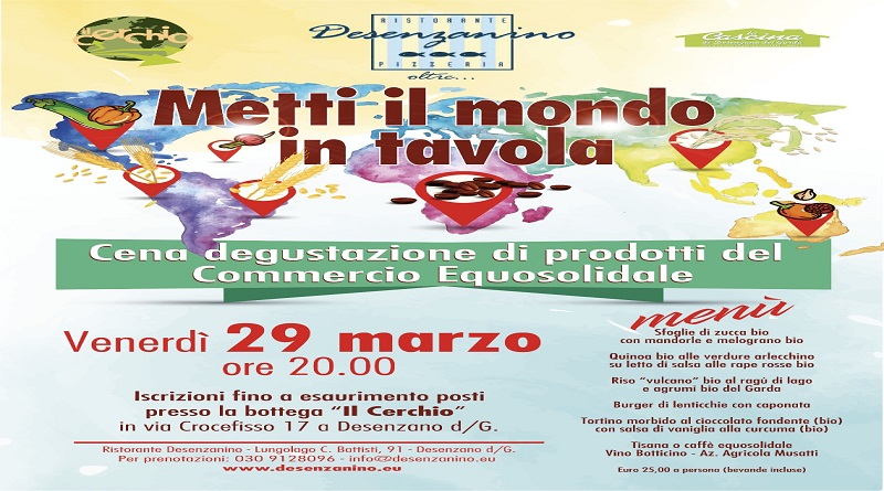 Il prezzo della cena “Metti il mondo in tavola” di venerdì 29 marzo è di 25 euro a persona, bevande incluse. Iscrizioni fino a esaurimento posti presso la bottega “Il Cerchio” in via Crocefisso 17 a Desenzano.