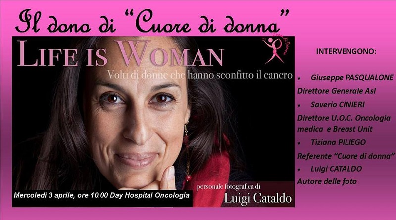 L’Associazione Cuore di donna donerà i ritratti della mostra fotografica “Life is woman – volti di donne che hanno sconfitto il cancro”, all’U.O.C. di Oncologia medica e Breast unit. Le 19 foto scattate dal brindisino Luigi Cataldo, rappresentano il primo progetto del genere realizzato nella città di Brindisi, e sono state esposte per la prima volta in occasione della festa della donna dello scorso anno, presso palazzo Nervegna. Il progetto è stato finanziato dalla LyondellBasell di Brindisi. Le foto rappresentano la forza e il coraggio di chi ha affrontato o sta ancora affrontando la malattia ma ne è uscito vincente. Un messaggio di positività e incoraggiamento per chi sarà costretto a passare da quelle stanze.