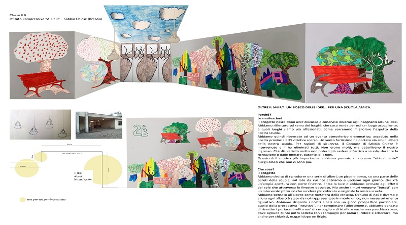 Il primo premio assoluto è così andato agli studenti dell’Istituto Comprensivo A. Belli di Sabbio Chiese (BS) che hanno realizzato un elaborato pensato per rendere speciali le pareti esterne dell’ingresso principale, il soffitto e le porte della loro scuola. “Oltre il muro. Un bosco delle idee… per una scuola amica” rappresenta un insieme di alberi diversi tra loro ma che crescono insieme, un elaborato che la giuria ha premiato all’unanimità per la capacità progettuale, il tema e l’idea.