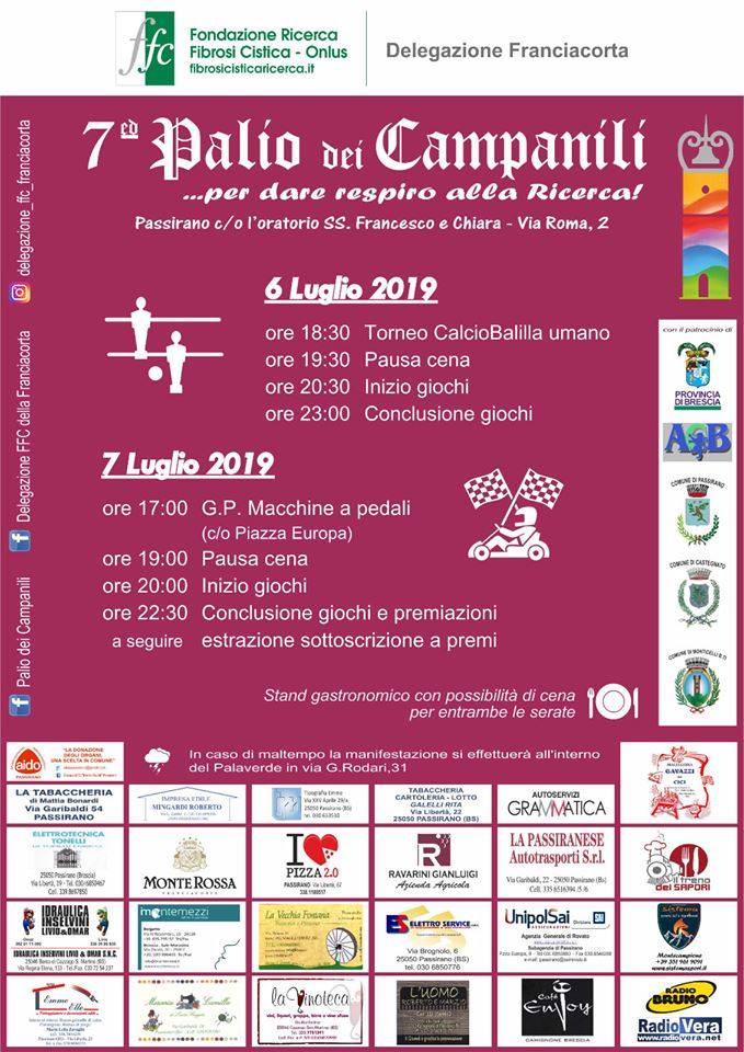 Sta per tornare, con la settima edizione, il Palio dei Campanili. L’evento si terrà sabato 6 e domenica 7 luglio all’oratorio SS. Francesco e Chiara di Passirano (via Roma 2) e si raccoglieranno fondi per la ricerca sulla fibrosi cistica.