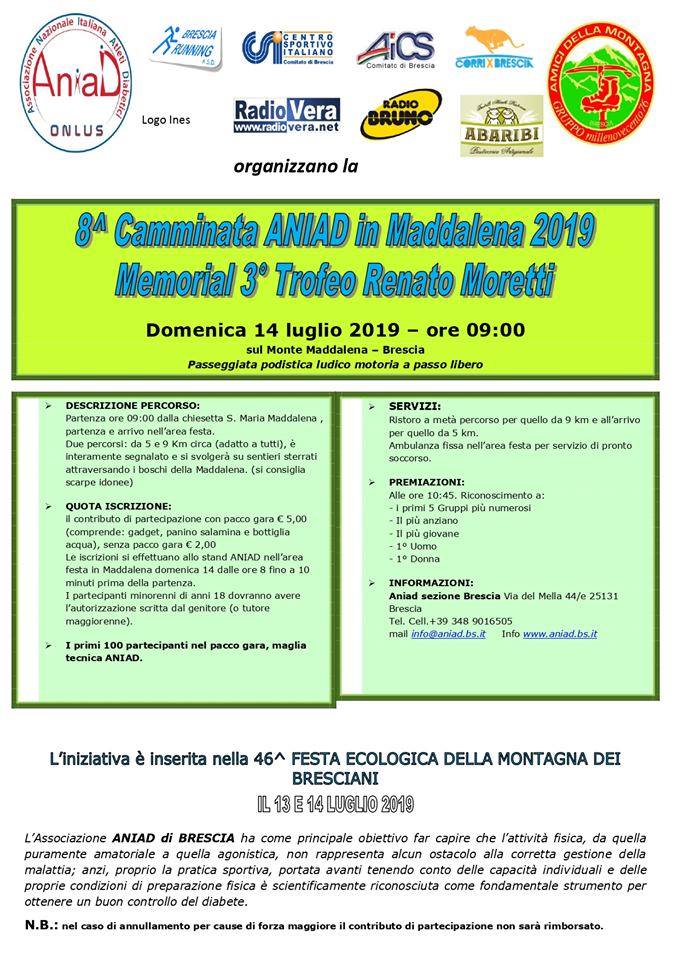 L’ANIAD (Associazione Nazionale Italiana Atleti Diabetici), insieme al Csi Brescia, Brescia Running, AICS di Brescia, Corri x Brescia, Amici della Montagna e Abaribi organizza l’ottava Camminata ANIAD in Maddalena, valida anche come 3° Trofeo Renato Moretti.