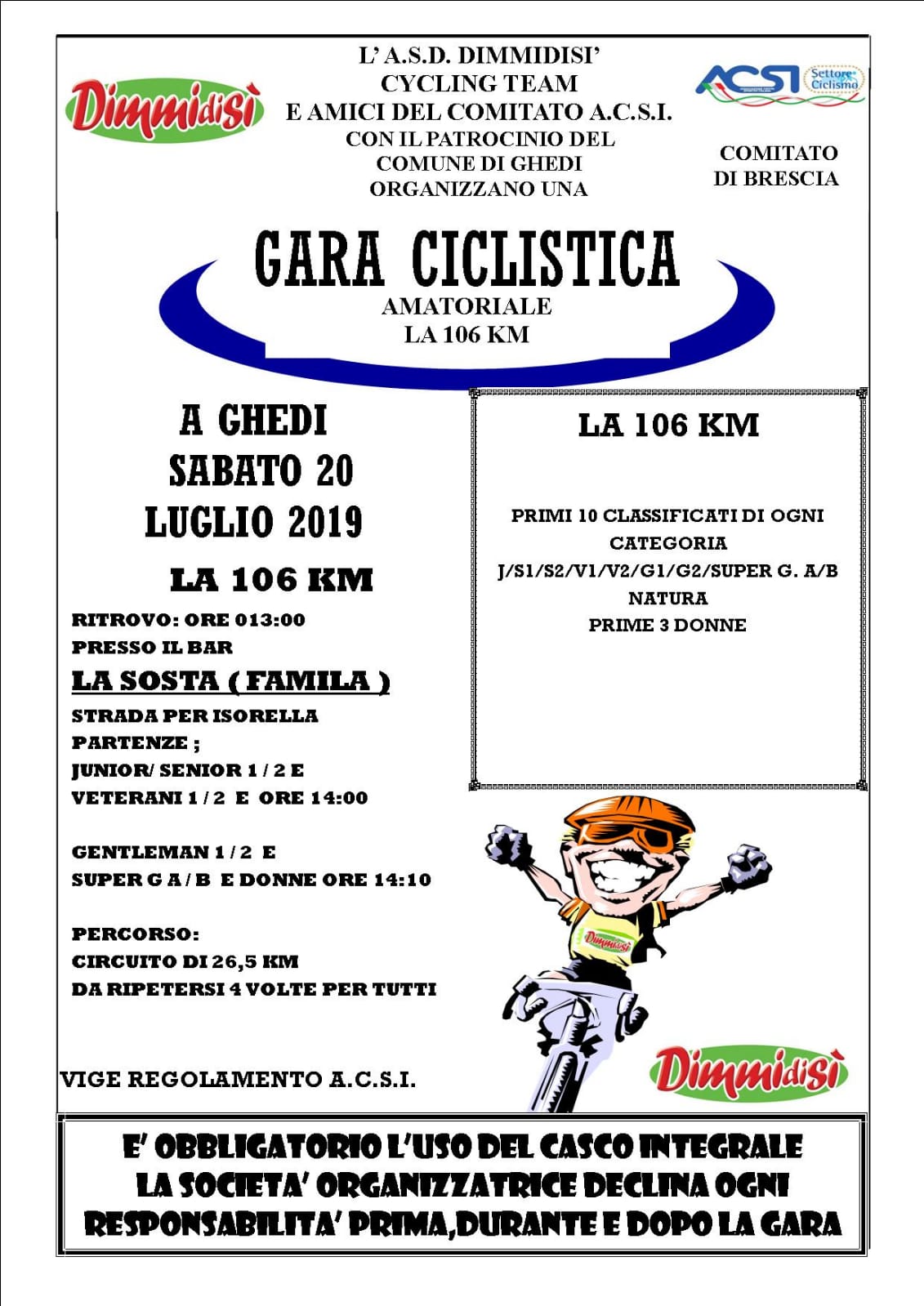 L’ASD Dimmidisì Cycling Team e Amici del comitato ACSI, con il patrocinio del Comune di Ghedi, organizzano per sabato 20 luglio “La 106 km”, una gara ciclistica amatoriale.