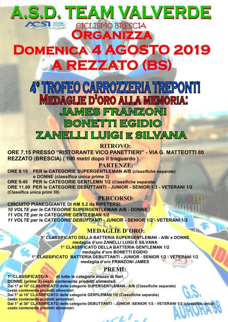 Eventi Sport 4° Trofeo Carrozzeria Treponti – Memorial Franzoni, Bonetti, Zanelli 1 Agosto 20191 Agosto 2019 admin 0 Commenti L’ASD Team Valverde organizza per la giornata di domenica 4 agosto il 4° Trofeo Carrozzeria Treponti, noto anche come “Memorial Franzoni – Bonetti – Zanelli”, una gara di ciclismo su strada che si svolgerà a Rezzato.