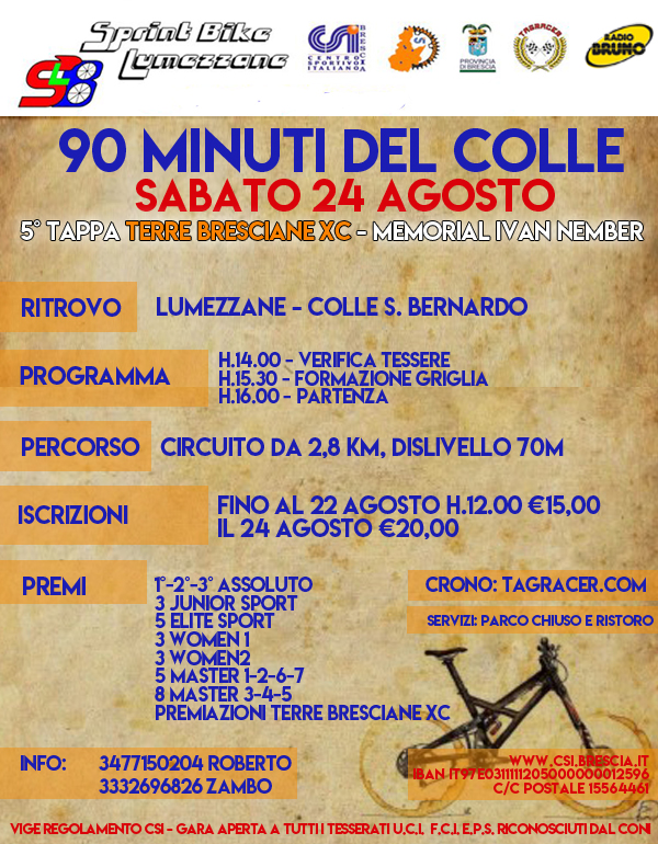 Sprint Bike Lumezzane organizza per Sabato 24 Agosto la quinta e ultima tappa del circuito Terre Bresciane XC: la 90 minuti del Colle.