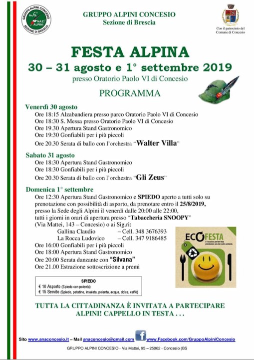 Appuntamenti Festa Alpina a Concesio 28 Agosto 2019 admin 0 Commenti Il Gruppo Alpini di Concesio organizza per il 30 e 31 Agosto e per l’1 Settembre la Festa Alpina presso l’Oratorio Paolo VI di Concesio. Non mancherà lo stand gastronomico, intrattenimento per i piccini, ballo e musica per i più grandi-