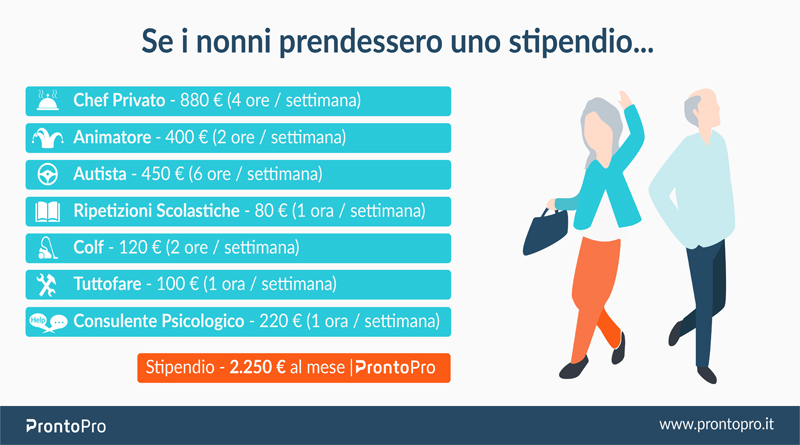 Sono più di 12 milioni i nonni in Italia, e, secondo un’analisi Ipsos, il 61% di loro supporta figli e nipoti nella gestione del menage familiare. Un dato che si distanzia molto dai colleghi europei, solo il 27% dei nonni d’oltralpe afferma infatti di svolgere in maniera attiva e costante il proprio ruolo. Alla luce di questo dato, e in occasione dell’imminente Festa dei Nonni, ProntoPro.it, portale che mette in contatto domanda e offerta di servizi professionali, ha voluto calcolare l’ipotetico stipendio dei nonni, nel caso venissero pagati per i preziosi servizi che ogni giorno offrono alla famiglia. Un salario che si attesterebbe intorno ai 2250 Euro al mese.