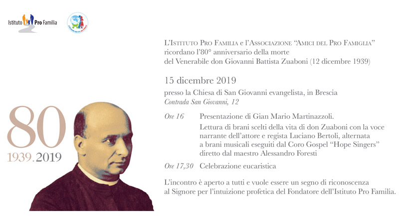 Domenica 15 dicembre 2019 l’Istituto Pro Familia e l’Associazione “Amici del Pro Famiglia” ricordano l’80° anniversario della sua morte; invitano tutti quelli che sono interessati alla commemorazione.