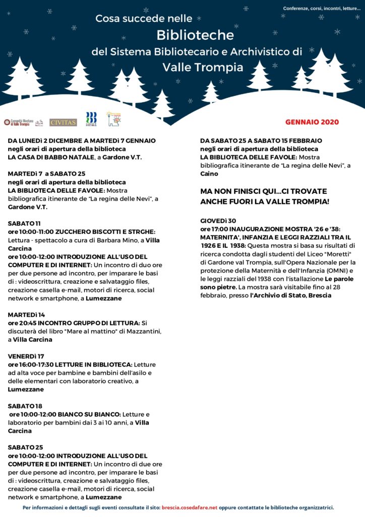 Appuntamenti Le iniziative di gennaio nelle biblioteche della Valle Trompia 3 Gennaio 2020 admin 0 Commenti Riportiamo di seguito le iniziative nelle biblioteche della Valle Trompia.