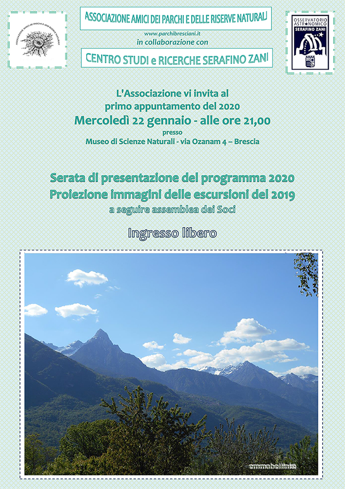 Prima serata dell’Associazione Amici dei Parchi per mercoledì 22 gennaio, alle ore 21, presso il Museo di Scienze di Via Ozanam 4 a Brescia. Sarà presentato il programma per l’anno 2020 e sarà proiettata una carrellata di immagini relative alle escursioni del 2019. A seguire assemblea dei Soci.
