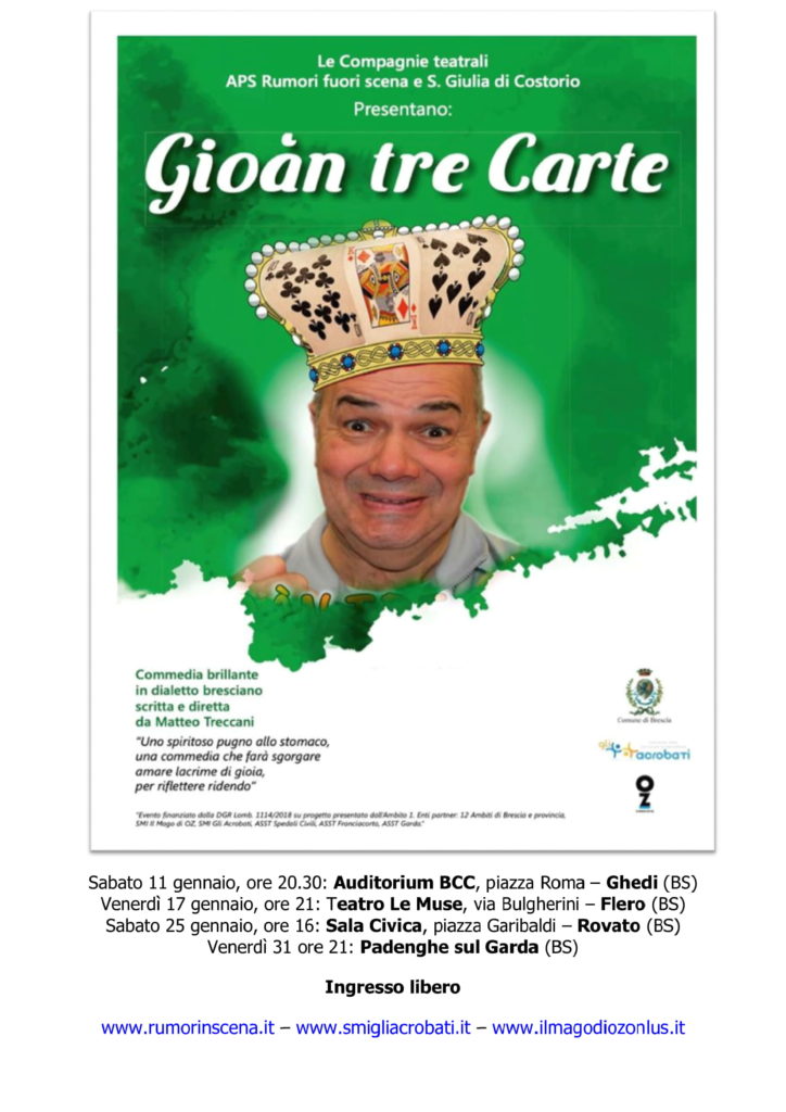 LA COMPAGNIA [2]: Formatasi qualche anno fa a Costorio di Concesio, la Compagnia Teatrale S.Giulia, dal 2013 è sotto la direzione di Matteo Treccani. Tra i suoi spettacoli vi sono: Me, le e joter e La schidìna (s)fürtünada, con quest’ultima, nel 2105, ha vinto il premio miglior regia al concorso “El Rial” di Montichiari. Nel 2018 unitasi per il progetto con l’associazione Rumori Fuori Scena e Nuova Impronta Teatro, sforna la fortunata commedia GIOAN TRE CARTE.