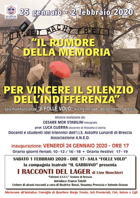 Il Circolo Acli Cristo Re accogliendo la proposta del professor Luca Guerra – docente di filosofia e storia -, del fotografo Cesare Mor Stabilini, dei Docenti e studenti (del triennio) dell’I.I.S. Astolfo Lunardi di Brescia e dell’ Associazione A.N.E.D., per la realizzazione di una mostra in occasione della Giornata della Memoria, ospiterà presso la Sala multifunzionale de “Il FOLLE VOLO” (Via Trento, 64A – Borgo Trento – Brescia),la mostra“IL RUMORE DELLA MEMORIA PER VINCERE IL SILENZIO DELL’INDIFFERENZA”.