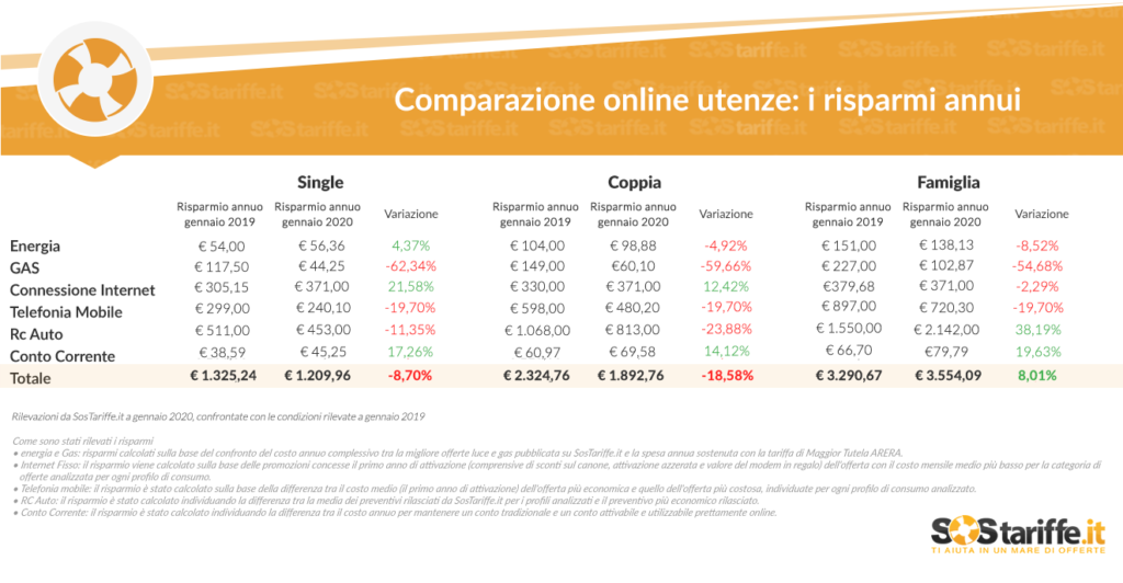 Nel 2020 sono i nuclei familiari a rilevare i maggiori risparmi: fino al 8% in più. Rispetto a gennaio dello scorso anno, in ogni caso, tutti i profili riescono ad alleggerire in modo significativo i costi bancari e quelli relativi alla connessione da rete fissa. Mentre invece risulta molto difficile contrastare i rincari per quanto riguarda il gas e la telefonia mobile.