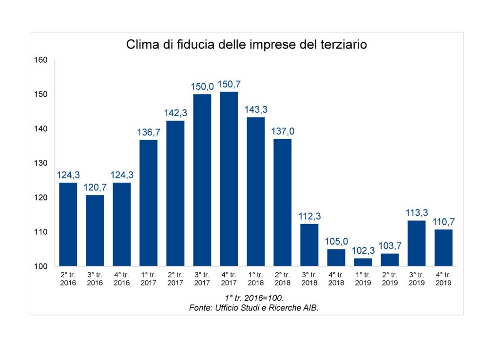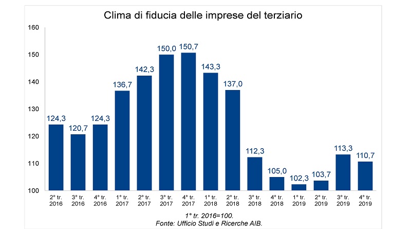 Nel 4° trimestre del 2019 l’indice di fiducia delle imprese bresciane attive nel settore terziario ha evidenziato una lieve discesa rispetto a quanto registrato nel periodo precedente. A evidenziarlo sono i risultati dell’Indagine Congiunturale dell’Ufficio Studi e Ricerche di AIB.
