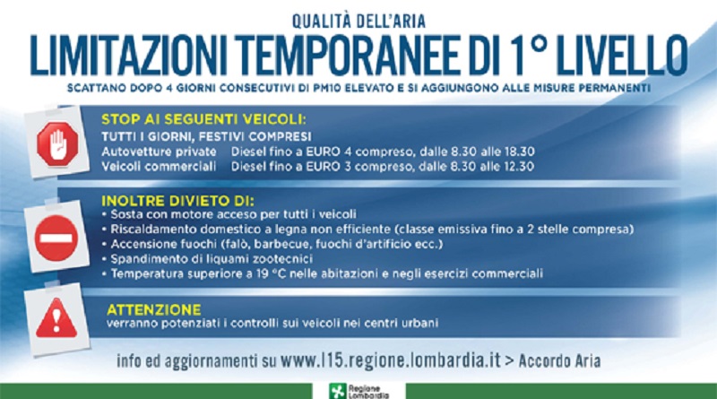 Il Comune di Brescia informa che, visto l’attuale andamento delle concentrazioni di Pm10 nell’aria, come stabilito da Regione Lombardia, a partire da martedì 4 febbraio sul territorio comunale entreranno in vigore i provvedimenti di primo livello.