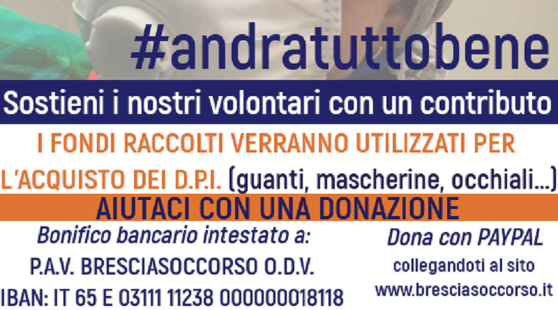 Dall’inizio dell’emergenza sanitaria, Bresciasoccorso ha aperto una raccolta fondi per garantire il costante approvvigionamento degli indispensabili Dispositivi di Protezione Individuale (guanti, mascherine, camici, occhiali…). Chiunque volesse partecipare all’iniziativa può donare il suo contributo tramite bonifico bancario intestato a P.A.V. BRESCIASOCCORSO O.D.V. – IBAN: IT 65 E 03111 11238 000000018118, oppure tramite PAYPAL collegandosi al sito www.bresciasoccorso.it.