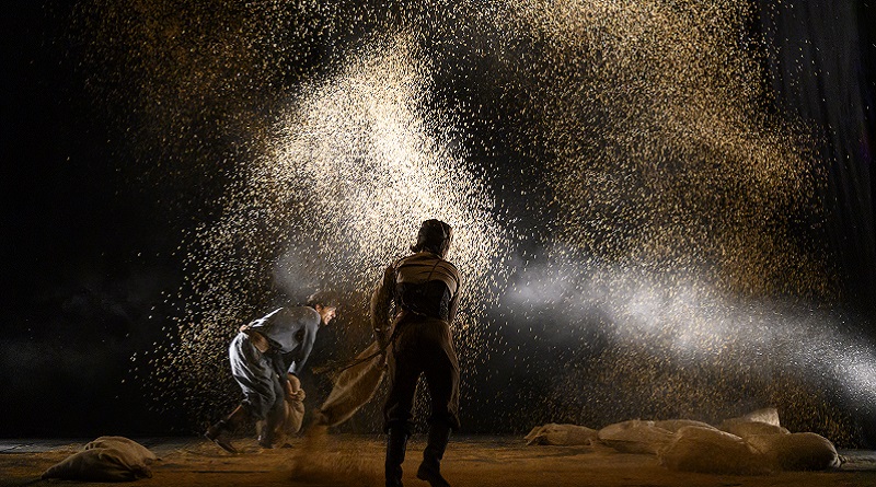 Sul palcoscenico la storia viene narrata con un gioco di parole e di movimento dove, con la voce e con il corpo, gli attori evocano e ci rendono partecipi di situazioni e paesaggi.