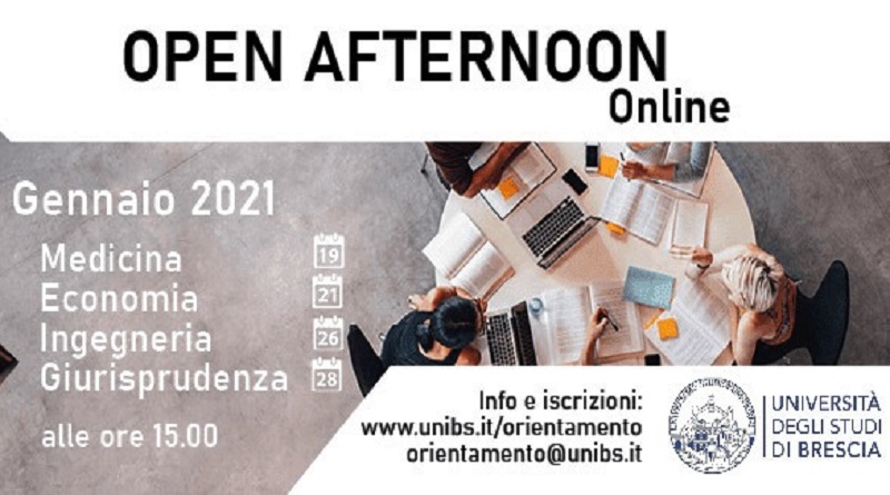 Torna da domani l’appuntamento con gli Open Afternoon, quest’anno in modalità online: un’opportunità di orientamento unica, aperta a tutti i ragazzi delle scuole superiori per conoscere i corsi di studio e i servizi offerti dall’Università degli Studi di Brescia. In diretta sulla pagina Facebook dell’Università, martedì 19 gennaio alle ore 15, l’Open Afternoon di Medicina; giovedì 21 alle 14:30, l’Open Afternoon di Economia; martedì 26 alle 15, l’Open Afternoon di Ingegneria; giovedì 28 alle 15, l’Open Afternoon di Giurisprudenza.