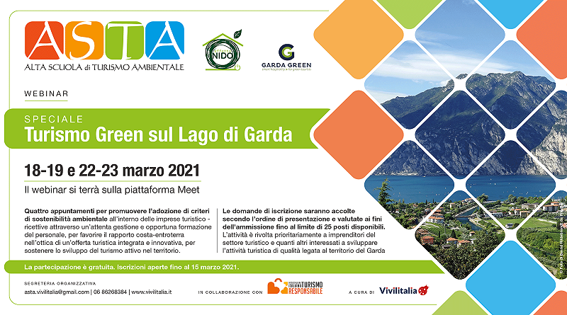 Al via un corso di formazione con l’Alta Scuola di Turismo Ambientale (A.S.T.A.)“Turismo Green al Lago di Garda”, sostenuto da Effetto Nido e da Legambiente Lombardia e Legambiente Verona. Quattro appuntamenti online (18, 19 ,22 e 23 Marzo) per 25 operatori turistici locali che vogliono perfezionare il percorso formativo e le competenze nel settore del management turistico ambientale, organizzati da Vivilitalia, la società di Legambiente che si occupa di turismo ambientale, in collaborazione con Effetto Nido e AITR, associazione Italiana Turismo Responsabile.
