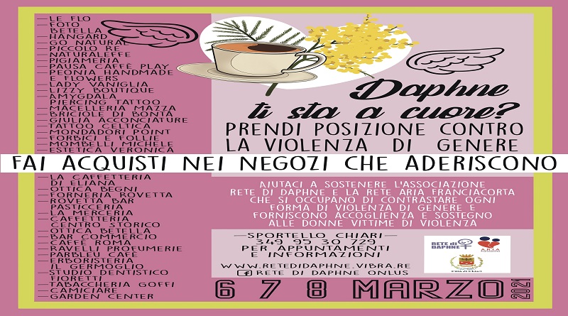 In occasione dell’8 marzo, Giornata Internazionale dei Diritti della Donna, l’associazione Rete di Daphne e la Rete Antiviolenza ARIA Franciacorta che costituiscono il Centro Antiviolenza dell’Ovest bresciano, organizzano l’iniziativa Daphne ti sta a cuore? Prendi posizione contro la violenza di genere!.