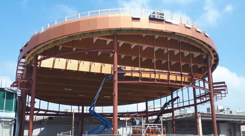 Quest’ultima è stata prefabbricata a piè d’opera, realizzando a terra due semicerchi in legno lamellare, dal diametro di 31 metri ciascuno, e successivamente collocati in quota tramite il sollevamento, per poi infine essere completati con pannelli di copertura di tipo Preconnect®.