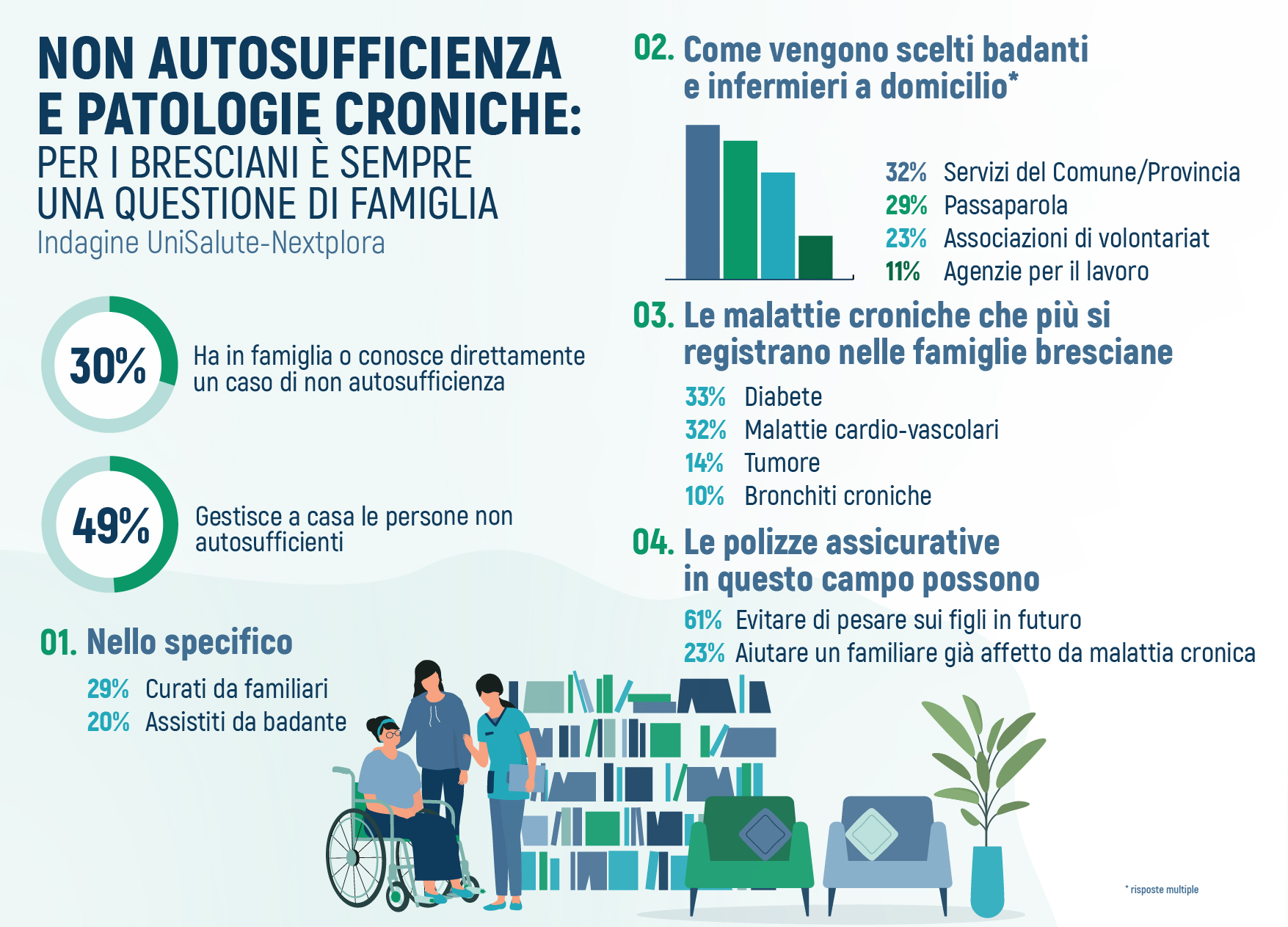 La popolazione italiana è tra le più vecchie del mondo: un dato che ha molte ricadute sul piano economico e sociale. Tra queste, una delle più impattanti è legata al gran numero di persone non autosufficienti, o affette da malattie croniche, che necessitano di specifiche attenzioni a livello quotidiano. In particolare, un bresciano su tre (30%) è personalmente a conoscenza, e spesso direttamente coinvolto nelle cure, di un proprio caro o amico che vive in una situazione di non autosufficienza.