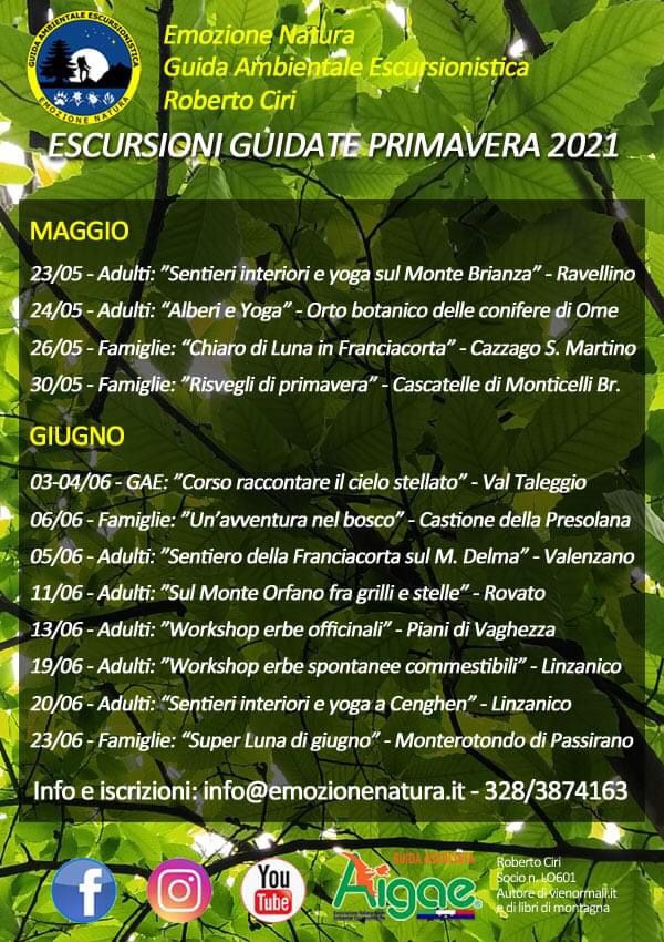 Dopo altri sei mesi di inattività sul campo, ma trascorsi a condurre corsi online di astronomia e attività naturalistiche per adulti e bambini, finalmente torno a farmi vivo con le mie proposte di escursioni, sperando che sia la volta buona… Che devo dire, guardiamo avanti e proviamo a ripartire! Dunque ecco le proposte per maggio e giugno che ho previsto per il momento, anche in Franciacorta, ma si aggiungeranno altre attività che vi segnalerò più avanti. Che dite, ripartiamo a camminare insieme?