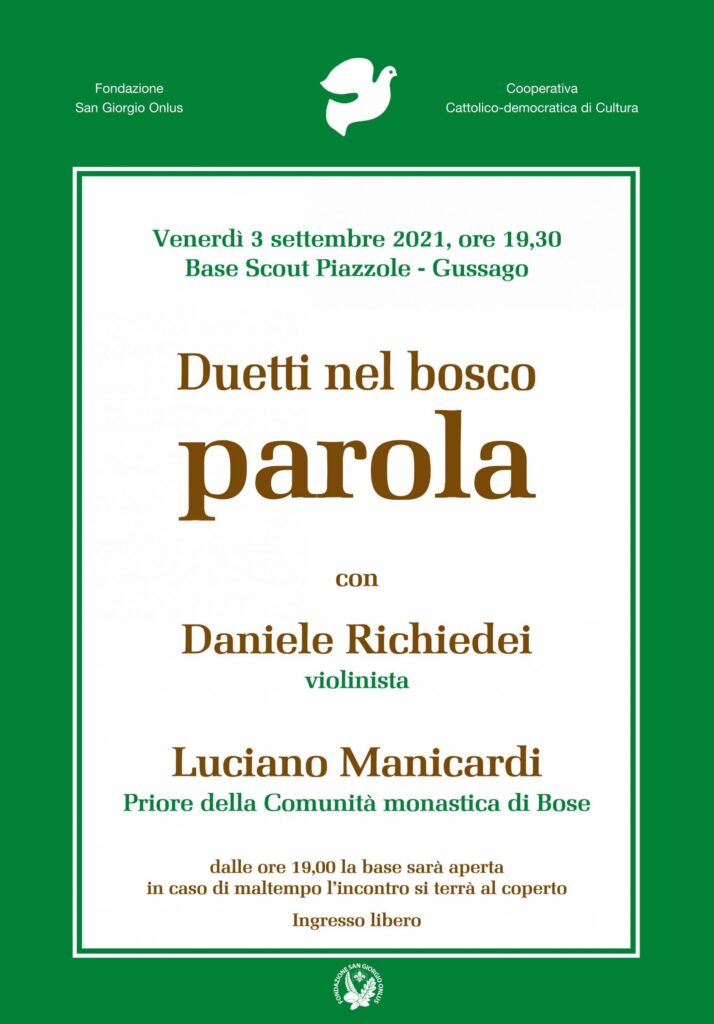 Per il quarto anno la Fondazione San Giorgio Onlus e la Cooperativa Cattolico-democratica di Cultura ripropongono i duetti nel bosco venerdì 3 settembre 2021 alle ore 19,30 presso la base scout di Piazzole (Gussago).