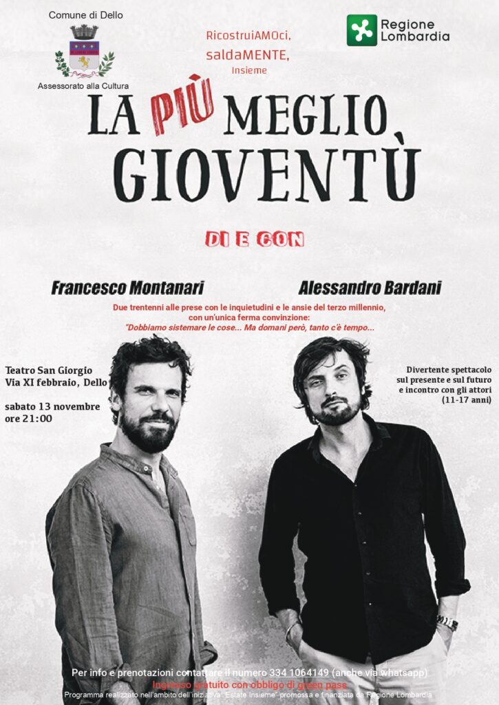 Gli attori delizieranno il pubblico con “LA PIU’ MEGLIO GIOVENTU’”, divertente spettacolo sul presente e sul futuro, scritto, diretto e interpretato da Alessandro Bardani, in scena con Francesco Montanari. Il reading, ricco di battute fulminanti, sarcastiche, ironiche e frizzanti, rappresenta il lato più leggero e dissacrante della scrittura di Bardani, con uno stile che si ispira a film come “Clerks” e “Coffee and Cigarettes” e al teatro canzone di Gaber. Nello stesso non mancano poi richiami a Woody Allen, Ben Stiller ma anche a Pier Paolo Pasolini, Marco Tullio Giordana (“La meglio gioventù”) e a Samuel Beckett (“Aspettando Godot”).