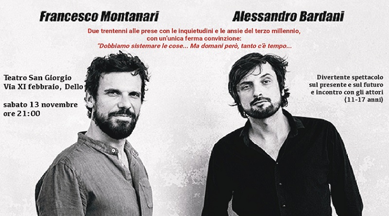 Francesco Montanari e Alessandro Bardani, nel ruolo di due trentenni (Aurelio e Niccolò), interagiranno sul palcoscenico, seduti allo stesso tavolino di un locale a scambiare opinioni sul mondo che li circonda, a esprimere e condividere ansie del tempo attuale, in un’atmosfera che vede mischiare sacro e profano, parlando apertamente a ruota libera con un’unica convinzione: “Dobbiamo sistemare le cose… Ma domani però, tanto c’è tempo…”.