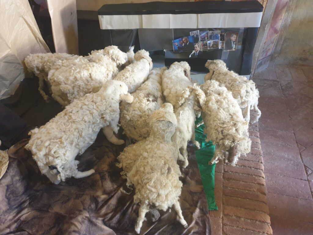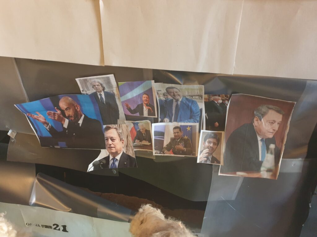 Il presepe raffigura un gregge di pecore “incantate” davanti ad un televisore in cui compaiono i volti di numerosi protagonisti della politica italiana, tutti nel mirino per i vaccini e Green pass, quest’ultimo ribattezzato “l’infame tessera verde”.