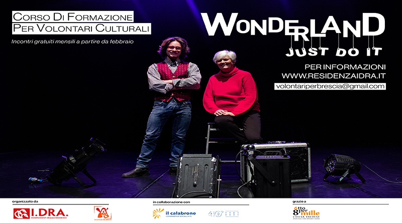 IDRA Teatro e Volontari per Brescia lanciano il corso di formazione gratuito Wonderland Just Do It!, un percorso culturale per conoscere i segreti della gestione di un evento, vivere il dietro le quinte e mettersi alla prova con l’organizzazione culturale. Un corso lungo 10 mesi rivolto a coloro che del teatro ne fanno il proprio oggetto di studio o passione: gli under 25 e gli over 60.