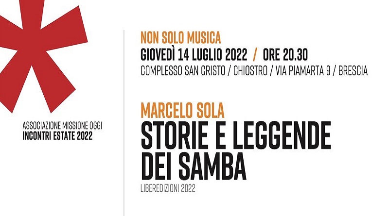 Giovedì 14 luglio, nel chiostro di San Cristo, avrà luogo il quinto appuntamento degli “Incontri Estate 2022” di “Missione Oggi”. Sarà un incontro speciale, in cui sarà presentato un libro che racconta di una particolare musica brasiliana, il samba. Il libro nasce dalla passione musicale di un immigrato brasiliano in Italia, Marcelo Sola, il quale, dopo aver raccontato storie e leggende dei samba, le ha raccolte in un libro, intitolato appunto: Storie e Leggende dei Samba. L’evento sarà esclusivamente in presenza.