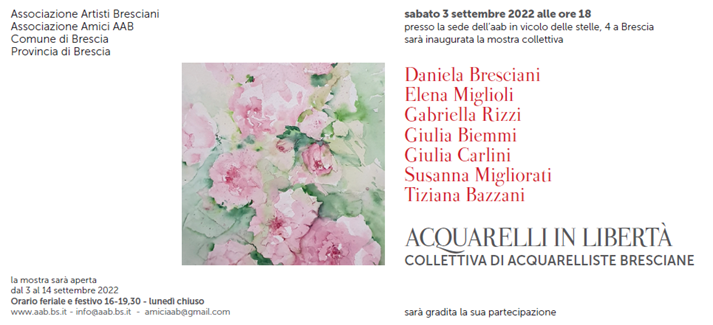 La stagione 2022 – 2023 dell’AAB parte con la mostra ACQUARELLI IN LIBERTÀ. COLLETTIVA DI ACQUARELLISTE BRESCIANE che si inaugura sabato 3 settembre 2022 alle ore 18 nella sede di vicolo delle stelle, 4 a Brescia.