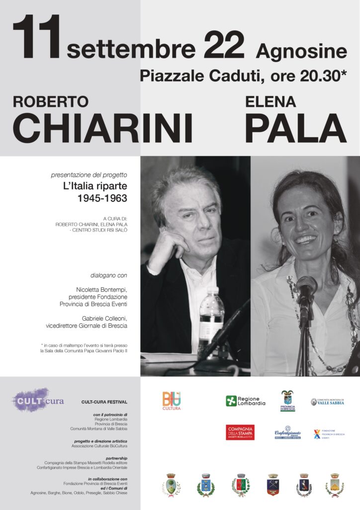 Domenica 11 settembre alle 20.30 in Piazza Caduti ad Agnosine arrivano Roberto Chiarini e Elena Pala per presentare il progetto “L’Italia riparte. 1945-1963“, iniziativa del Centro Studi sulla RSI che si propone di indagare la spinta propulsiva che ha generato all’indomani della fine della seconda guerra mondiale la ricostruzione a Brescia e, più in generale, in Italia: la Leonessa d’Italia, distrutta dai pesanti bombardamenti del 1944-’45, prontamente rinasce. Scommette sul futuro: il proprio e quello del Paese. Una «tensione ricostruttiva», quella di settant’anni fa, che si ripropone con forza oggi, nel momento dell’uscita dal dramma del Covid-19. A dialogare con i due studiosi Gabriele Colleoni, vicedirettore del Giornale di Brescia, e Nicoletta Bontempi, presidente della Fondazione Provincia di Brescia Eventi: a Palazzo Martinengo in città verrà ospitata la prima tappa della mostra itinerante.