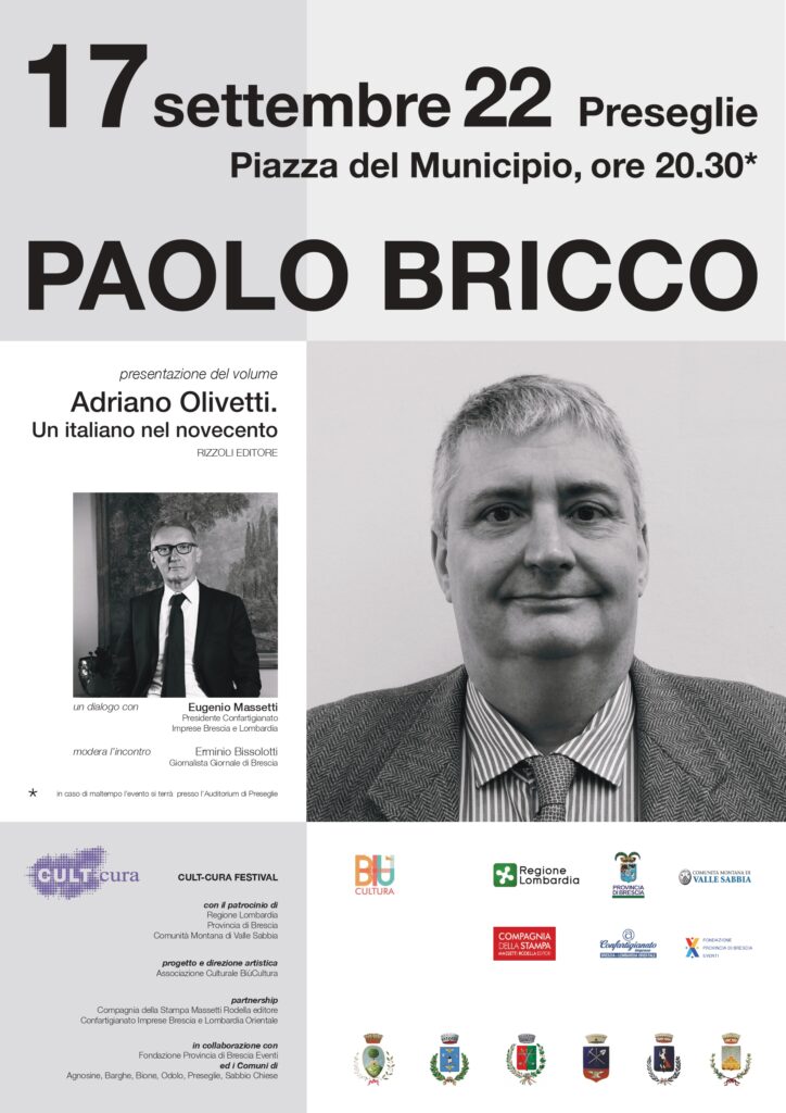 Gran finale di questa edizione del festival sabato 17 settembre alle 20.30, presso la Piazza del Municipio di Preseglie, l’incontro con Paolo Bricco, in dialogo con Erminio Bissolotti, giornalista del Giornale di Brescia, per presentare il suo ultimo libro “Adriano Olivetti. Un italiano del Novecento“, edito da Rizzoli. Con loro Eugenio Massetti, presidente di Confartigianato Brescia e Lombardia Orientale, a rimarcare il focus economico dell’appuntamento in un momento storico delicato come quello che l’Italia, l’Europa, il Mondo stanno vivendo. Paolo Bricco è giornalista e saggista, è inviato speciale del “Sole 24 Ore”. Si occupa di storia contemporanea e di storia economica. Ha scritto Olivetti prima e dopo Adriano (L’Ancora del Mediterraneo 2005), L’Olivetti dell’Ingegnere. 1978-1996 (il Mulino 2014), Marchionne lo straniero (Rizzoli 2018, nuova edizio-ne BUR 2020) e Cassa Depositi e Prestiti (il Mulino 2020). Ha un dottorato di ricerca in Economia all’Università di Firenze. Dal 2007 al 2013 è stato membro del Consiglio direttivo dell’Archivio Storico Olivetti. Nel 2016 si è aggiudicato come saggista il Premio Biella Letteratura Industria e nel 2019, come giornalista, il Premiolino.