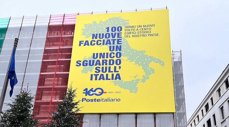 Risalta, sopra lo sfondo del telo tricolore installato, un pannello di 150 mq circa, che riporta il profilo della penisola italiana, con cento punti gialli che simboleggiano gli edifici interessati. L’Azienda celebra con 100 facciate la propria storia e la capillarità sul territorio nazionale con oltre 12.800 Uffici Postali ogni giorno accanto ai cittadini. Una presenza che garantisce al 94% degli italiani di essere a meno di 5 minuti di distanza da un punto di accesso ai servizi di Poste Italiane.