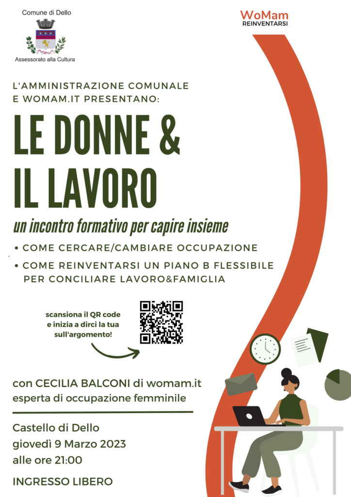 L’Amministrazione Comunale e WoMam.it, presentano “LE DONNE & IL LAVORO”, un incontro formativo per capire insieme come cercare/cambiare occupazione e come reinventarsi un piano B flessibile per conciliare lavoro e famiglia. “Dall’incontro con Cecilia Balconi, esperta di occupazione femminile ed ideatrice della piattaforma “WoMam”, prende forma e si concretizza il desiderio di aiutare le donne nella realizzazione di sé, anche in ambito lavorativo”, afferma Rossella Cavalli (Assessore ai Servizi Sociali e Vicesindaco di Dello). “Giovedì 9 marzo offriremo spunti e opportunità per mettersi in gioco e reinventarsi, ma soprattutto per prendere consapevolezza delle proprie potenzialità, in quanto madri ma prima di tutto Donne”. L’incontro, con ingresso libero, è infatti aperto a tutte le donne, non solo a quelle che hanno scoperto il dono della maternità, ma anche agli uomini che potrebbero trovare spunti interessanti per le proprie mogli, compagne, figlie e nipoti. Sarà un’occasione per aiutare le donne a reinventarsi un Piano B lavorativo, per essere libere di gestire il proprio tempo e sentirsi realizzate, da un punto di vista personale, professionale ed economico. Sarà l’inizio di una nuova avventura.