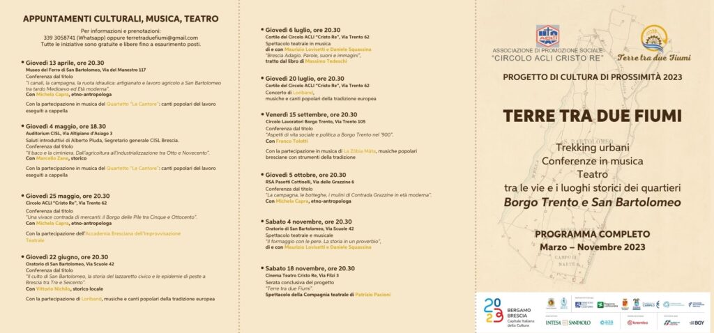 Il progetto di cultura di prossimità TERRE TRA DUE FIUMI, cofinanziato dal Comune di Brescia e inserito nel palinsesto di Bergamo Brescia Capitale della Cultura 2023, nasce da un’idea del gruppo di lavoro formato da Beatrice Nardo, Michela Capra, Franco Tolotti ed Ezio Torazzi.