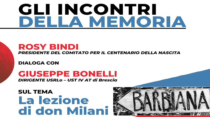 Il secondo appuntamento proposto da Casa della Memoria per il ciclo “Gli incontri della memoria” è previsto giovedì 26 ottobre alle ore 10 al Teatro Sant’Afra di vicolo dell’Ortaglia 10. A dialogare sul tema “La lezione di don Lorenzo Milani” saranno l’onorevole Rosy Bindi e il dirigente dell’Ufficio Scolastico Territoriale Giuseppe Bonelli. L’evento, creato in occasione del centenario dalla nascita di don Lorenzo Milani, è aperto alle studentesse e agli studenti ma anche alla cittadinanza. In questo caso è richiesta la prenotazione gratuita del posto scrivendo a casamemoria@libero.it.
